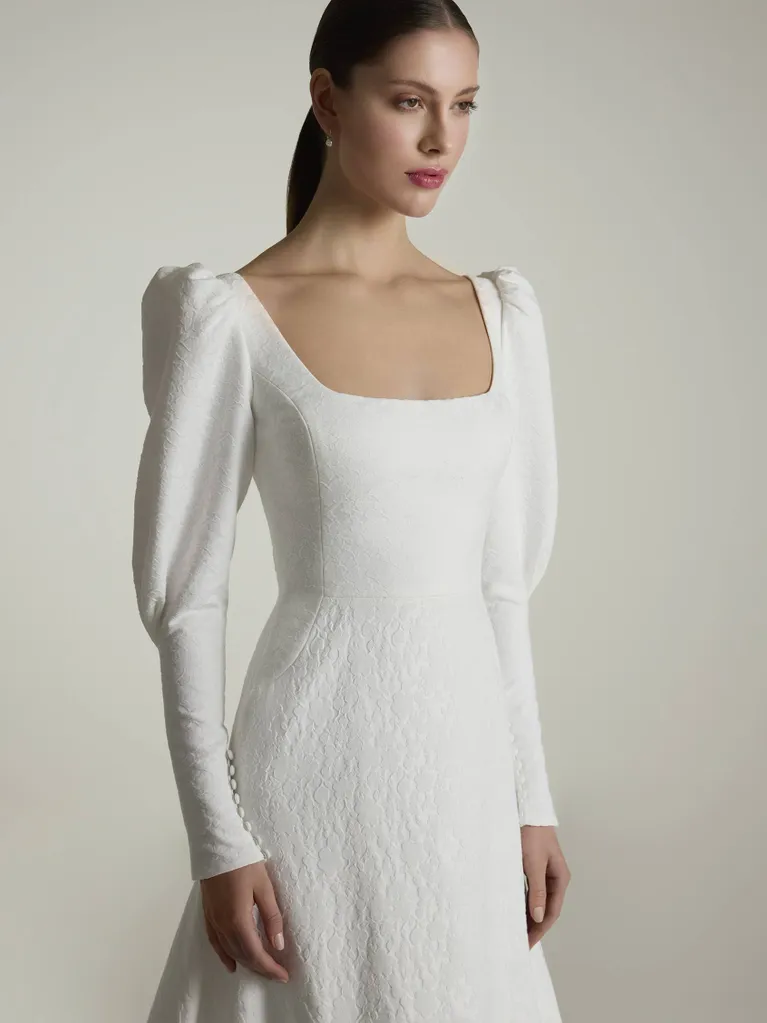 Ideal para las novias que celebran su boda durante los meses más fríos. Su diseño de corte en A totalmente confeccionado en jacquard presenta un escote cuadrado en la parte delantera y en la parte trasera, así como unas elegantes mangas de estilo abullonado que se estrechan en la zona del antebrazo adornadas con exquisitos detalles de botones.