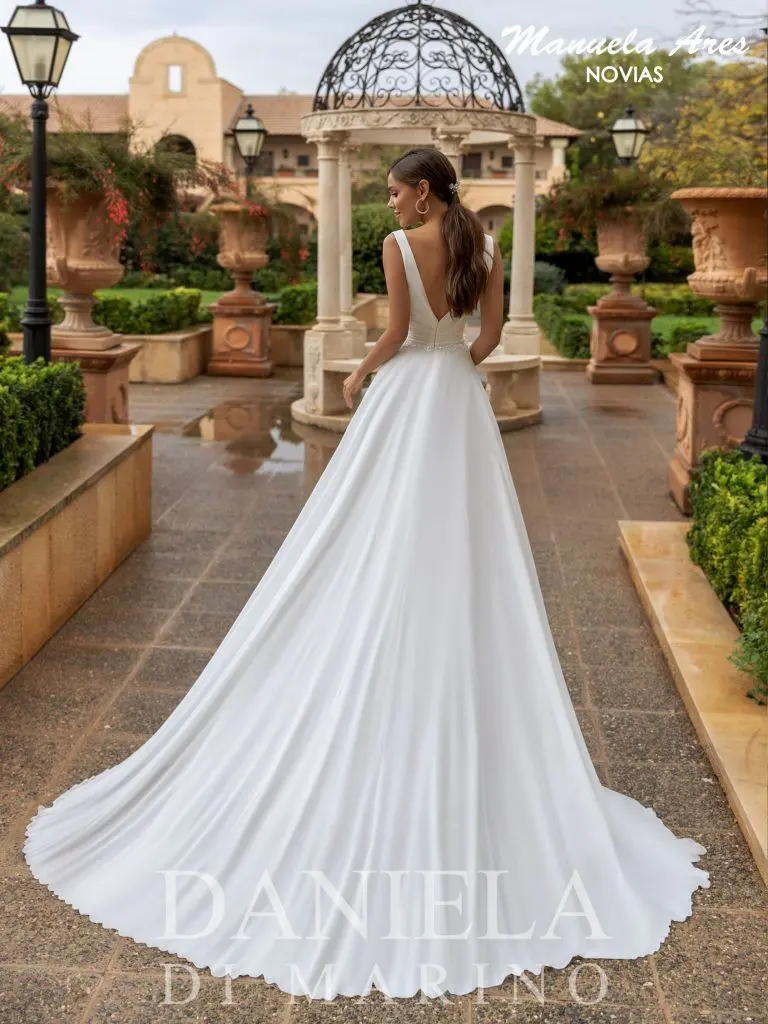 Este vestido de novia se define por sus toques románticos y está hecho para el alma inspirada. El drapeado envolvente muestra la cintura, mientras que una falda de gasa de línea A fruncida fluye suavemente hacia abajo. Disponible en marfil.