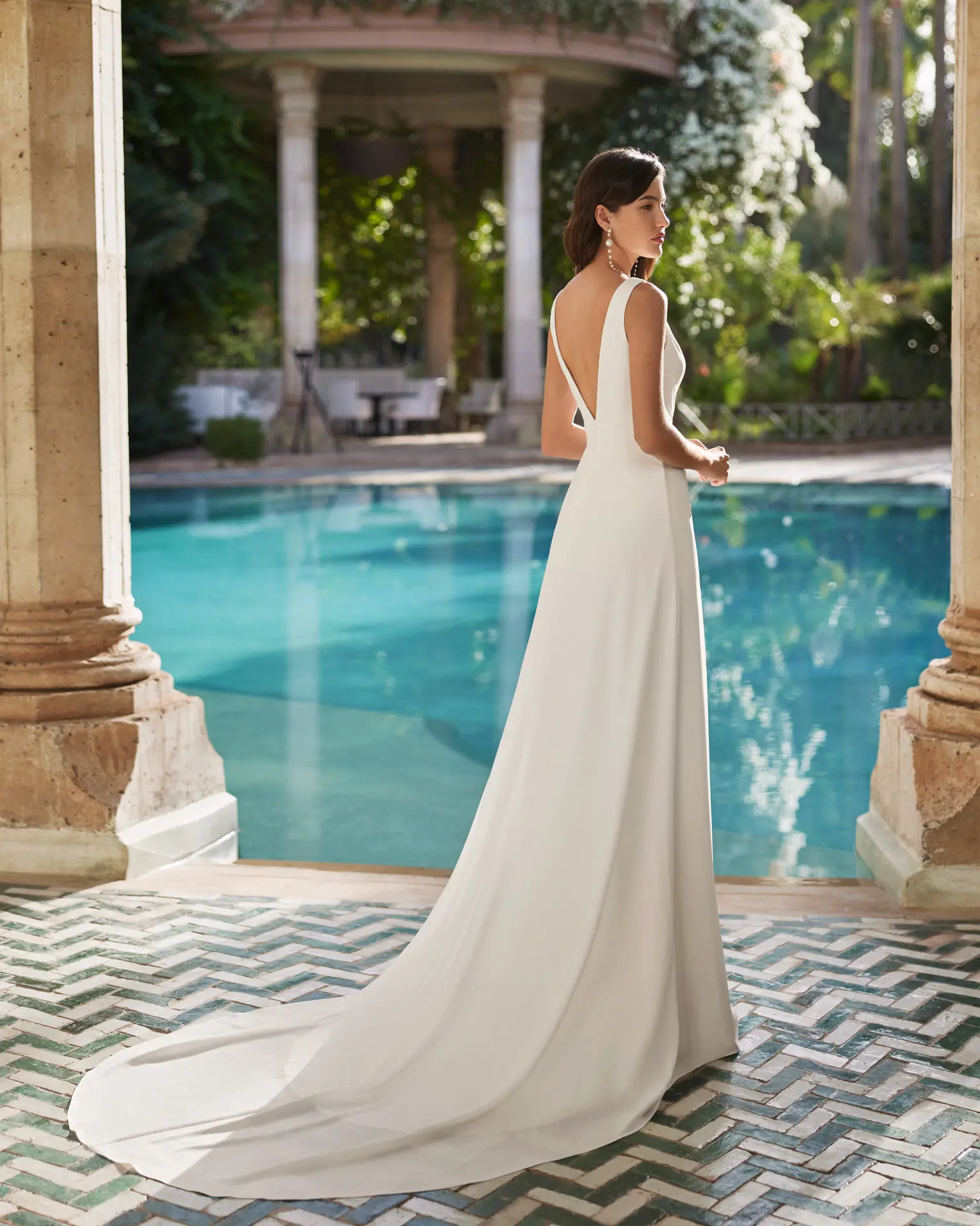 Vestido de novia de corte recto y estilo sexy, confeccionado en crepé. Con escote profundo, espalda en V y capa de georgette, este outfit Adriana Alier es exclusivo.