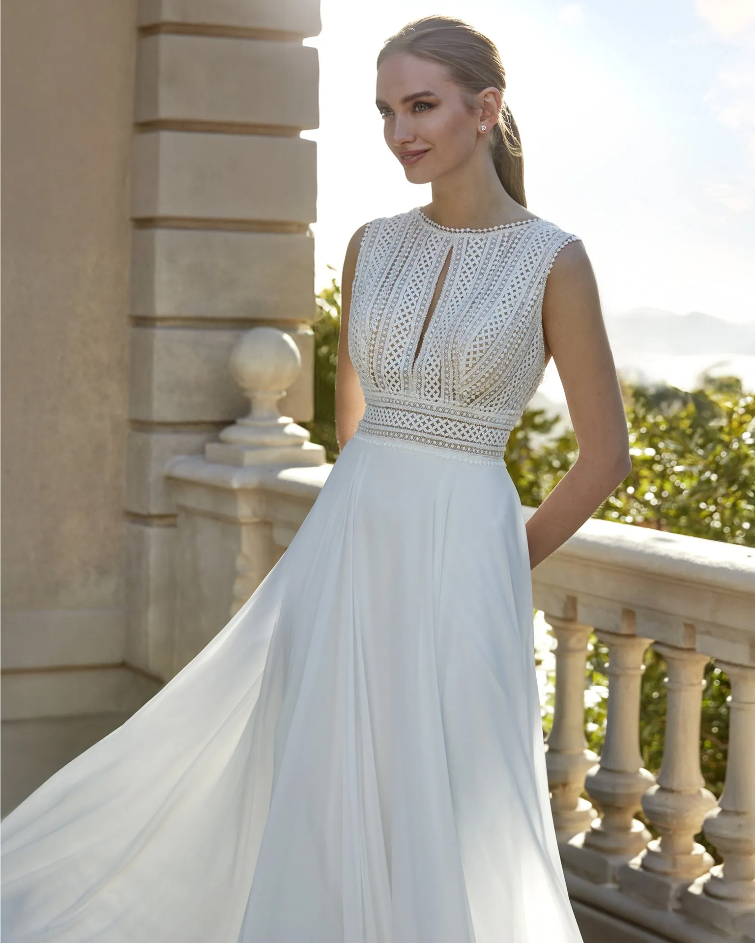Vestido en chiffon con encaje y pedrería, de silueta en línea A. El escote barco y la espalda en pico aportan un equilibrio entre clasicismo y modernidad, ideal para una novia con gusto refinado.