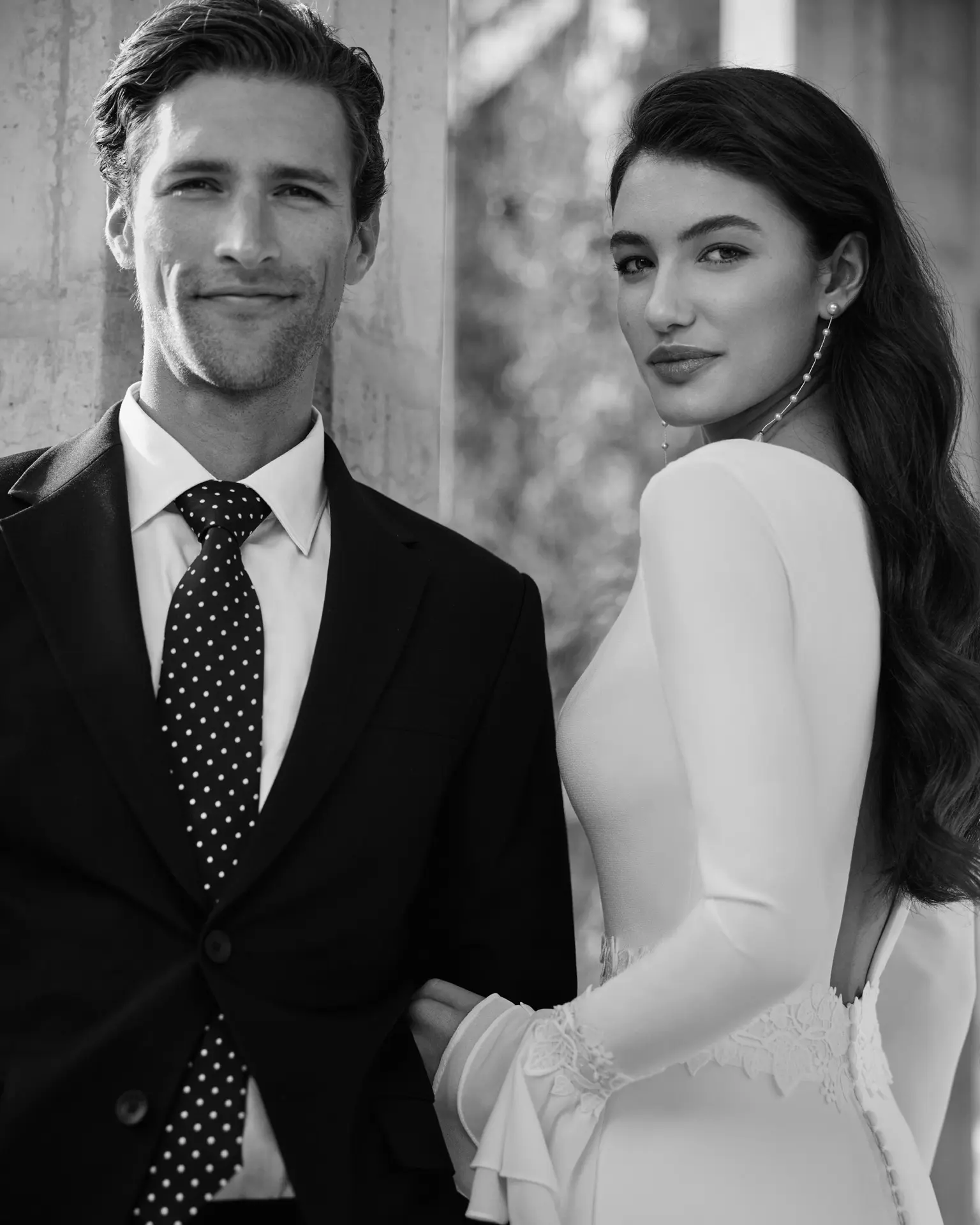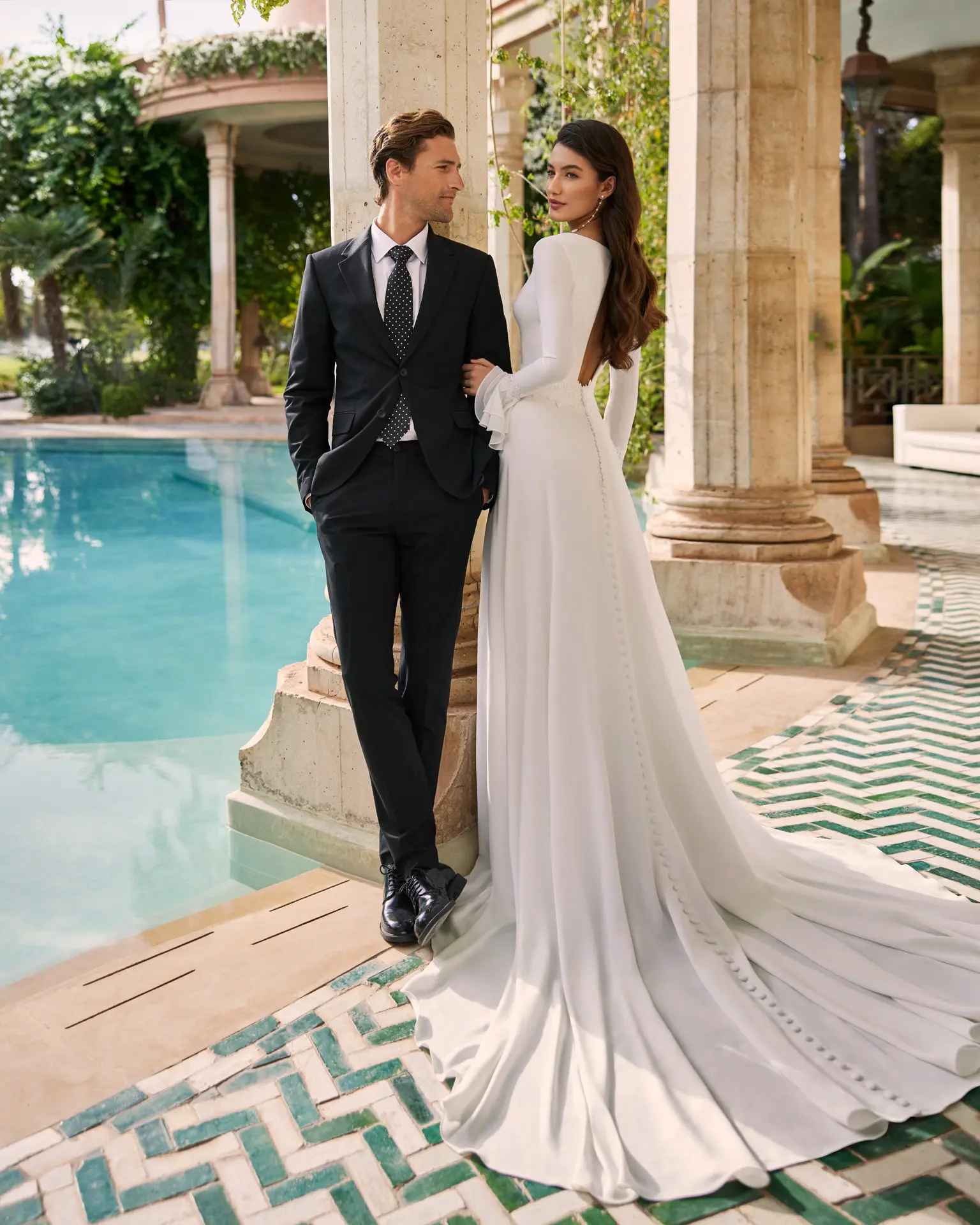 Vestido de novia línea A y estilo romántico , confeccionado en crepé . Con escote en V, espalda con lagrima y manga larga.