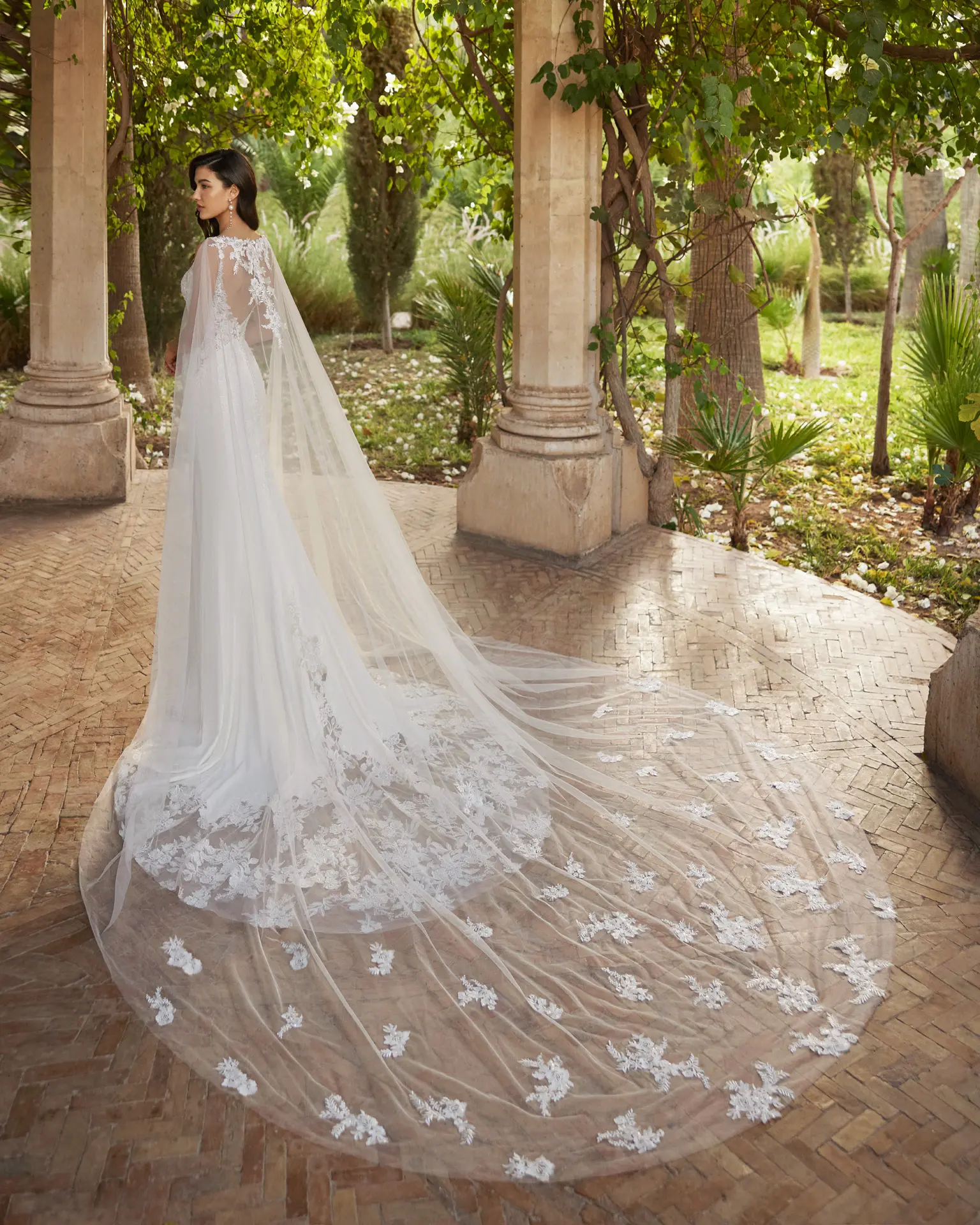 Vestido de novia de corte sirena y estilo sexy, elaborado con crepé y combinado con encaje y pedrería. Con escote en V, espalda descubierta y tirantes, este look Adriana Alier es de ensueño.