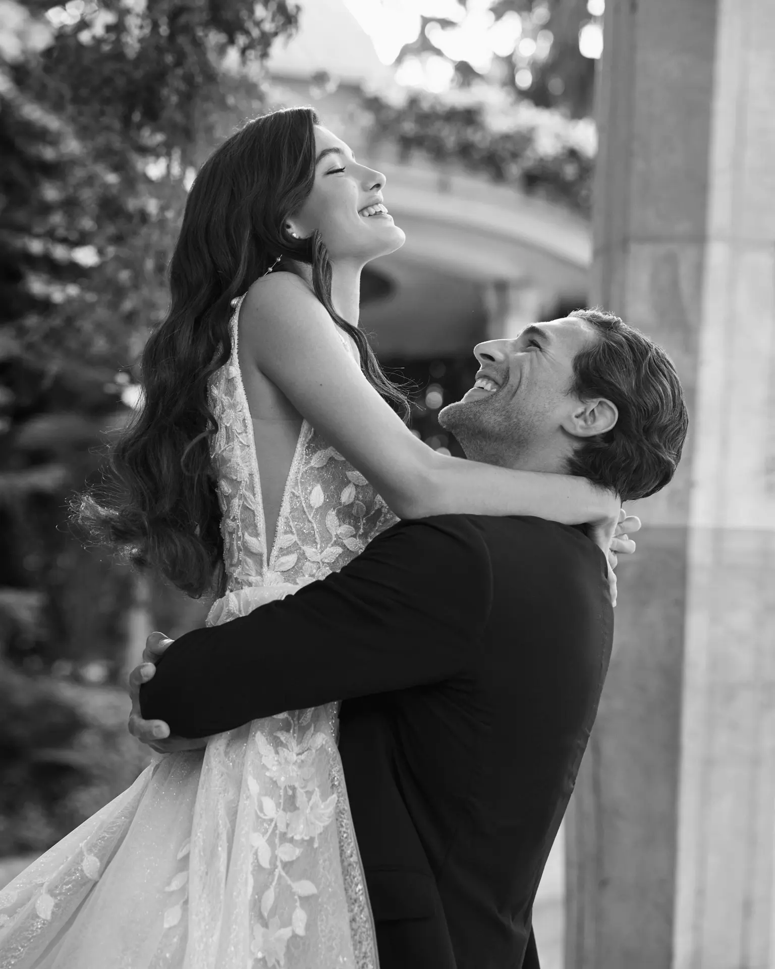 Vestido de novia de corte princesa y estilo romántico, elaborado con tul, encaje y pedrería. Con escote y espalda en V, este modelo Adriana Alier es exclusivo.