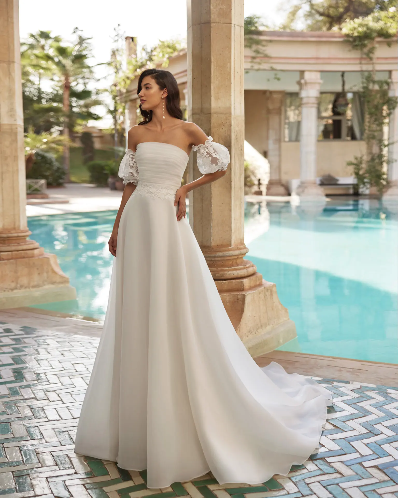 Vestido de novia línea A y estilo romántico, elaborado con organza y guipur. Un escote palabra de honor y una manga abullonada extraíble de guipur componen este outfit Adriana Alier de ensueño.
