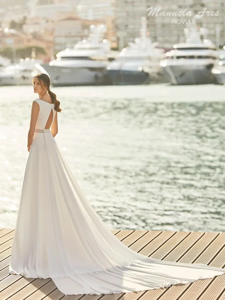 Ibis es un vestido ligero para novias que quieren sentir el movimiento a cada paso. Con una silueta recta, un cuerpo liso, escote barco y tirantes, este modelo cumplirá todos tus sueños. Este sencillo traje con la espalda descubierta incorpora una cola extraíble que es sensacional para una ceremonia civil.