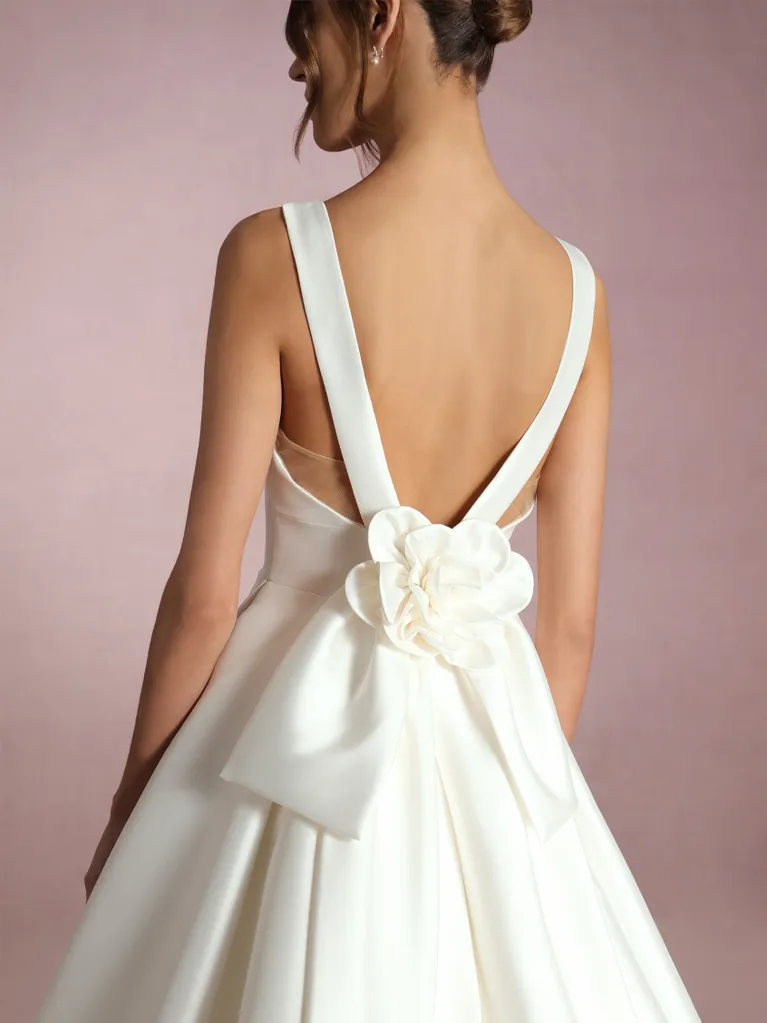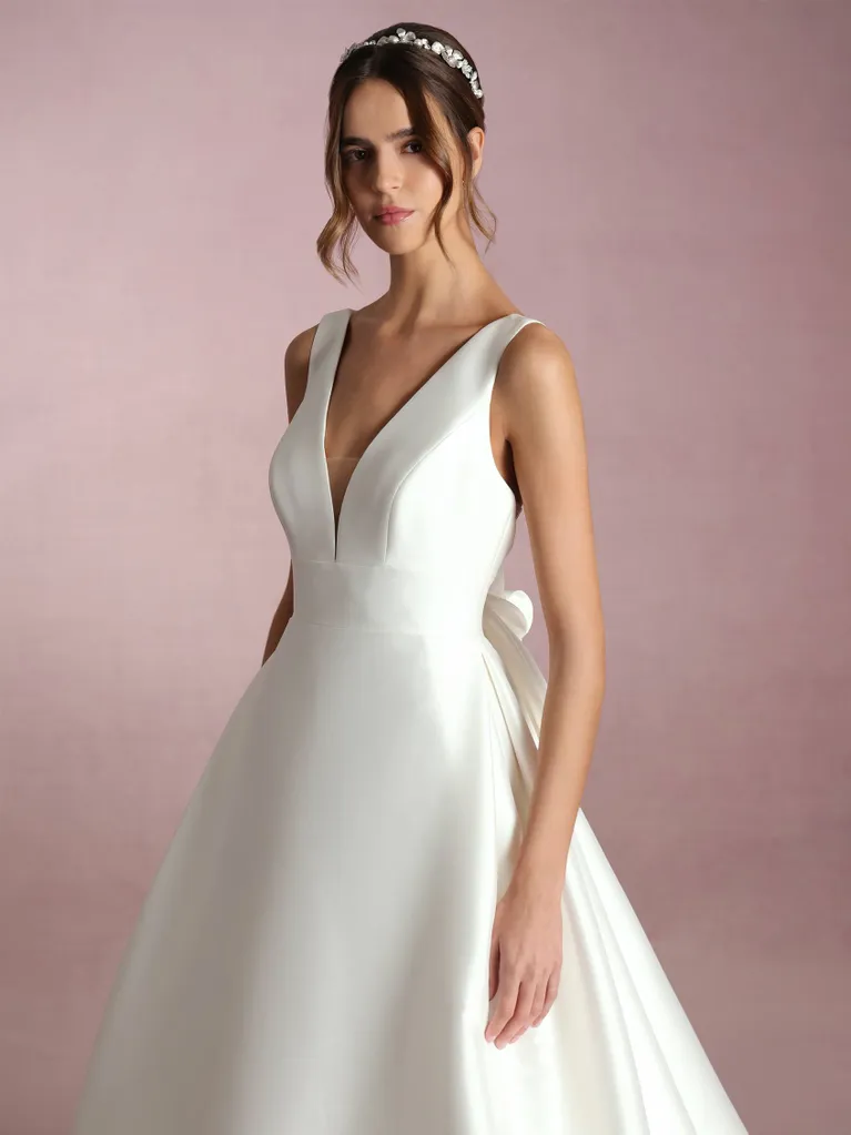 Diseño sencillo y delicado. Confeccionado en clásico mikado, cuenta con un escote en pico pronunciado y tirantes anchos que recorren toda la espalda hasta llegar a un gran lazo que adorna la parte posterior de la cinturilla ajustada. La falda, lisa al igual que el resto del diseño, presenta un corte en A que favorece a todas las figuras y aporta un aire soñador al modelo.