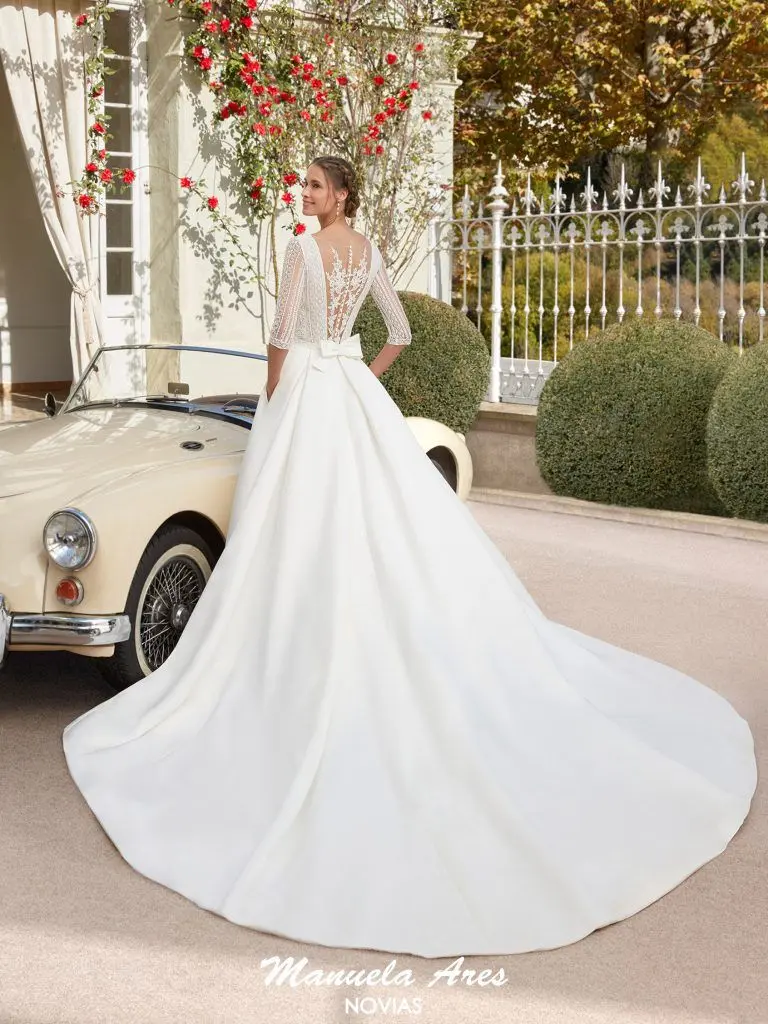 Isama es un vestido de corte princesa que destila clase con su detallista cuerpo de encaje. El cuello barco y la manga caída estilizan el busto y le confieren un punto de elegancia único. Presenta un escote ilusión de encaje en la espalda e incorpora prácticos bolsillos en la falda. Esta pieza es perfecta para las novias con curvas.