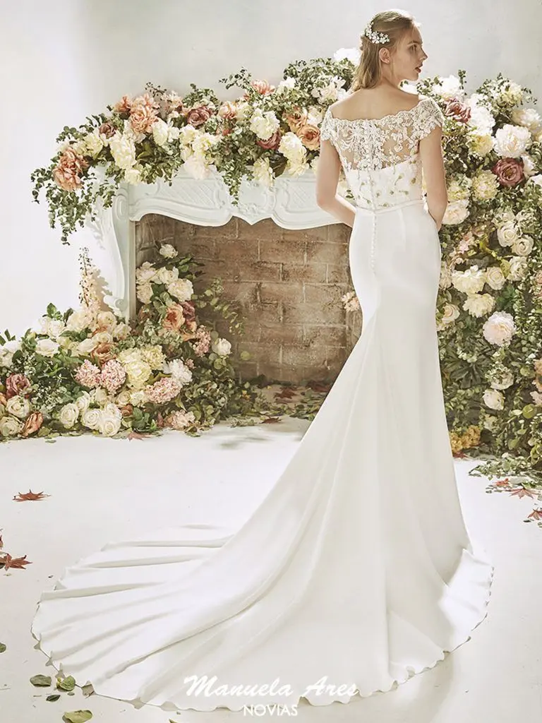 Vestido sirena de efecto dos piezas, con una elegante falda crepe y un sensual cuerpo de tul bordado con hilo bicolor y pedrería, y un favorecedor escote barco con manga corta y transparencias.