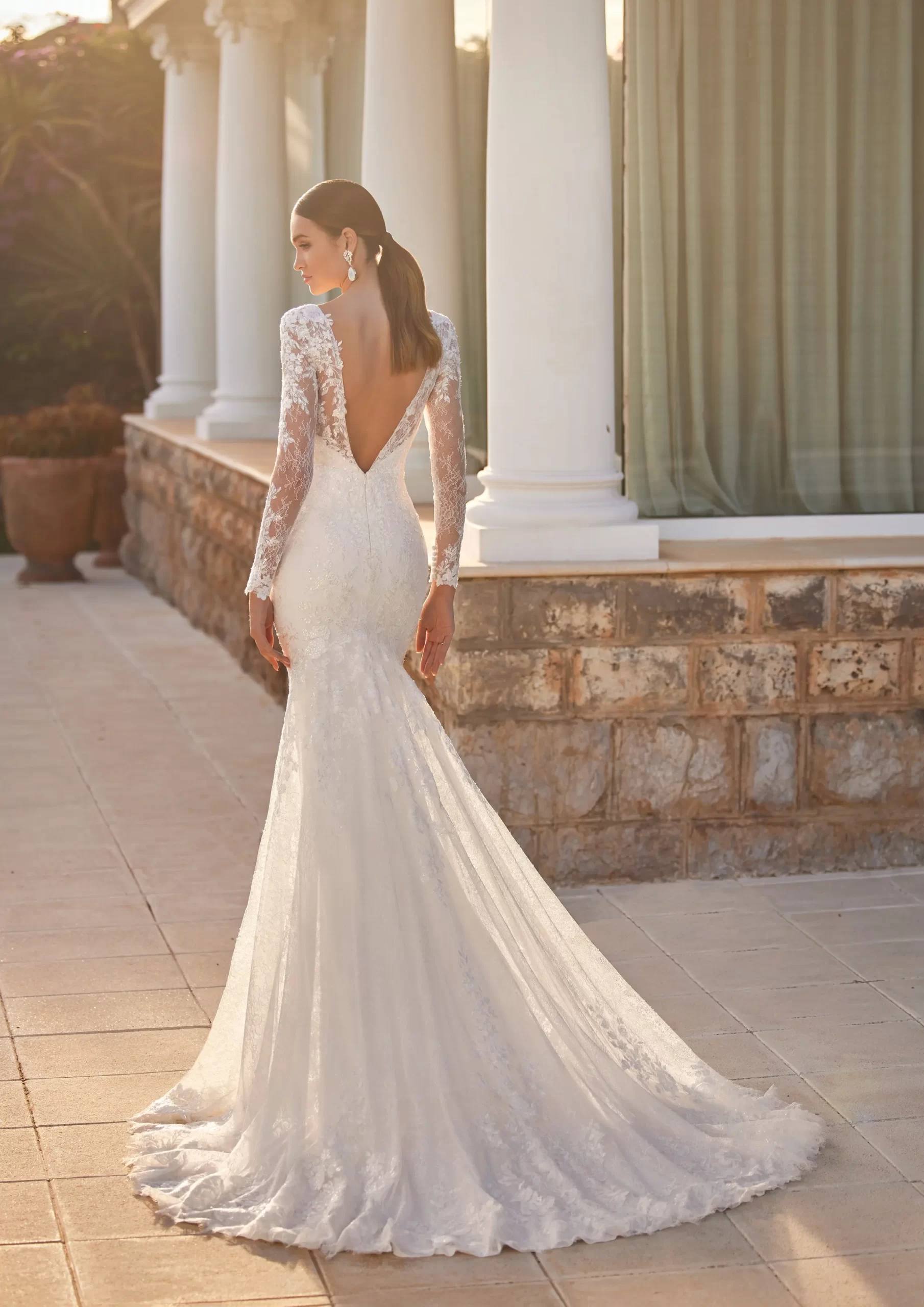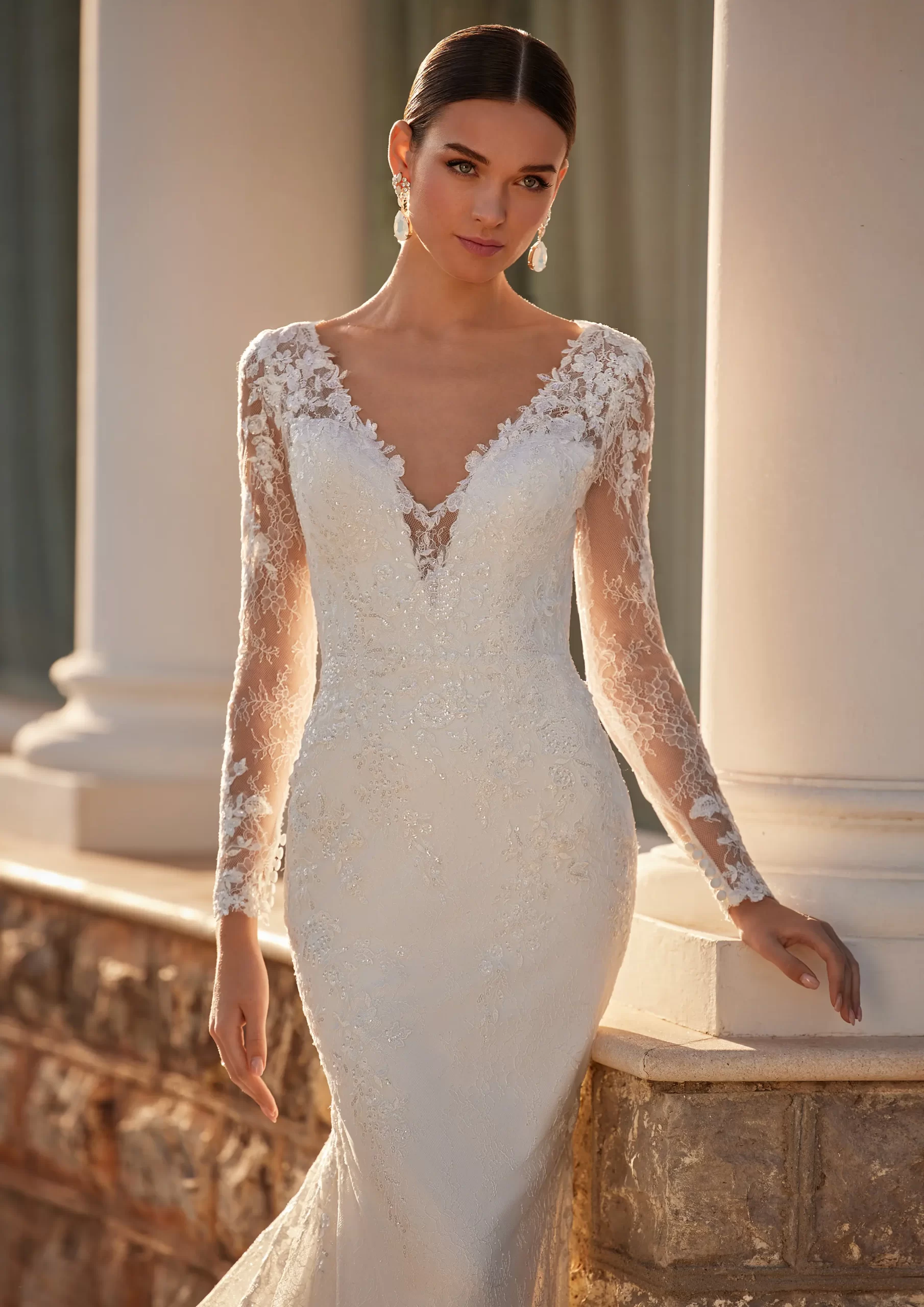 Un lujoso vestido sirena de encaje y chantilly con un estilo y una confección excepcionales. Se ha diseñado teniendo en cuenta todos los aspectos para realzar y estilizar la figura femenina, este vestido de novia presenta delicadas mangas de encaje, un profundo escote en pico y una pronunciada espalda de corte ajustado fit & flare.