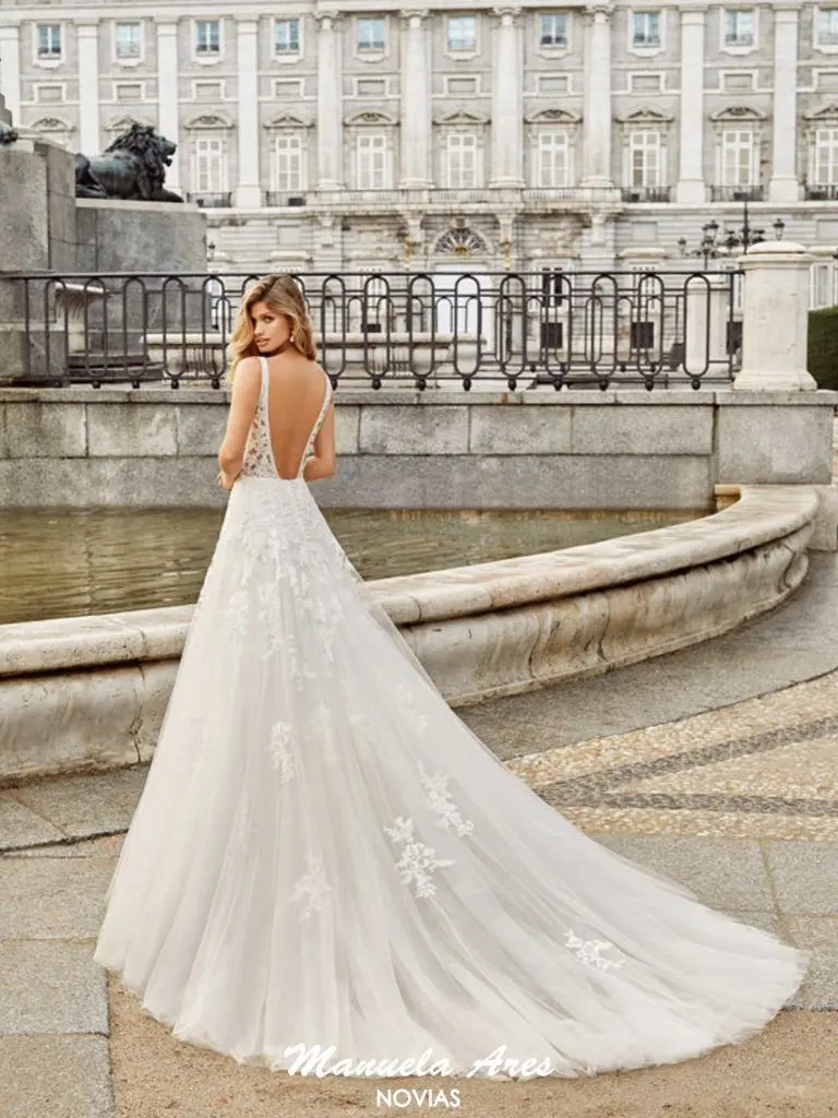 Vestido de novia estilo princesa de encaje y tul. Con escote en V, tirantes de pedrería y espalda abierta.