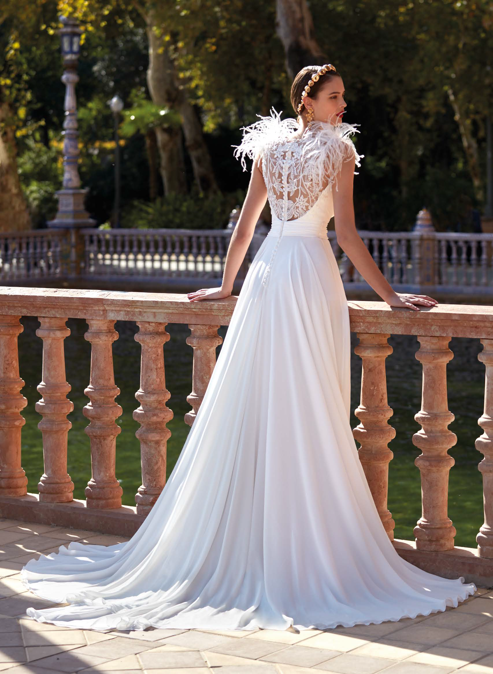 Si te atraen los vestidos lisos y con detalles sutiles, este es tu vestido ideal. La elegancia de su corte en A se funde a la perfección con la sencillez exquisita que desprende el cuerpo. El escote en V enmarca el busto y se completa con unos originales tirantes de plumas. La espalda femenina destaca al ser semitransparente adornada con encaje, dejando paso a una falda lisa confeccionada en georgette.